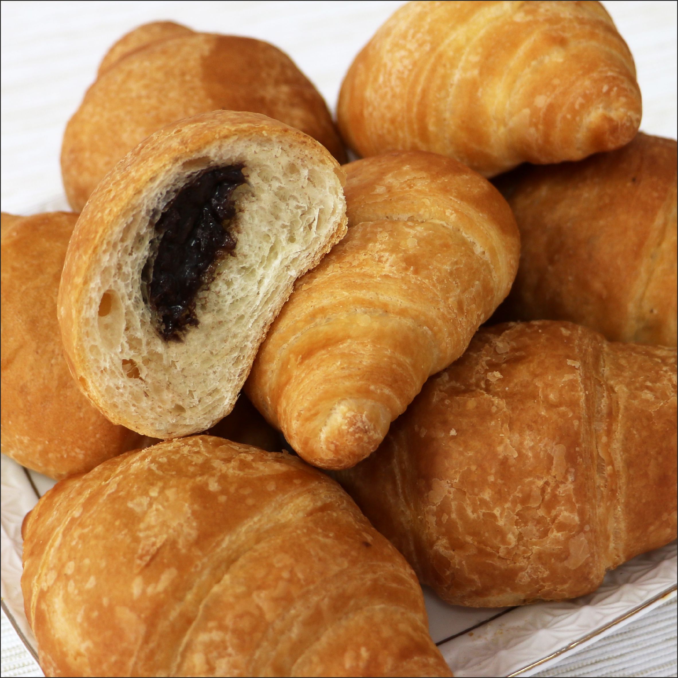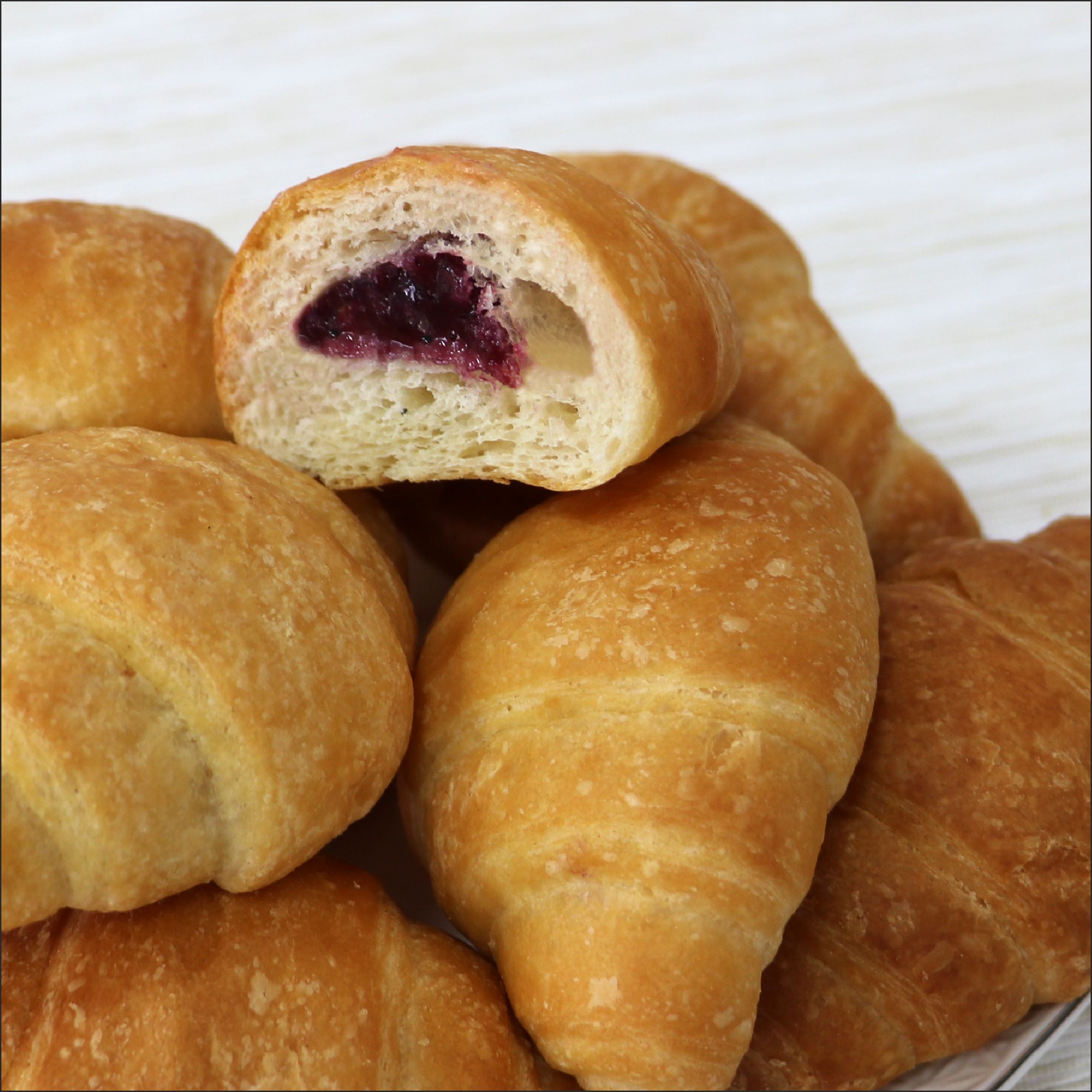 Миниатюрные воздушные круассанчики из дрожжевого слоёного теста в виде рогалика с начинкой из сочного черничного джема и сгущённого молока.