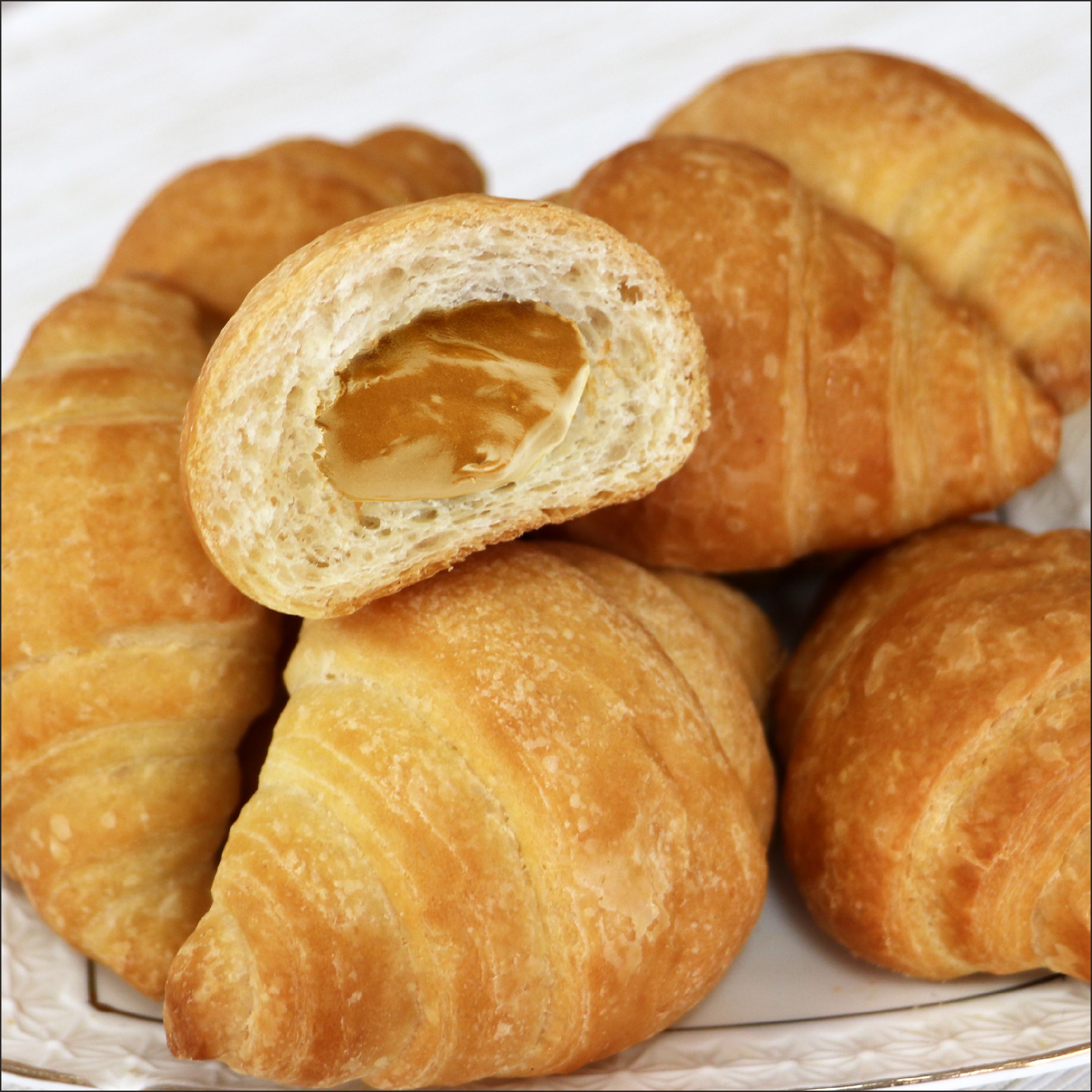 Миниатюрные воздушные круассанчики из дрожжевого слоёного теста в виде рогалика с любимой начинкой из сгущённого молока.