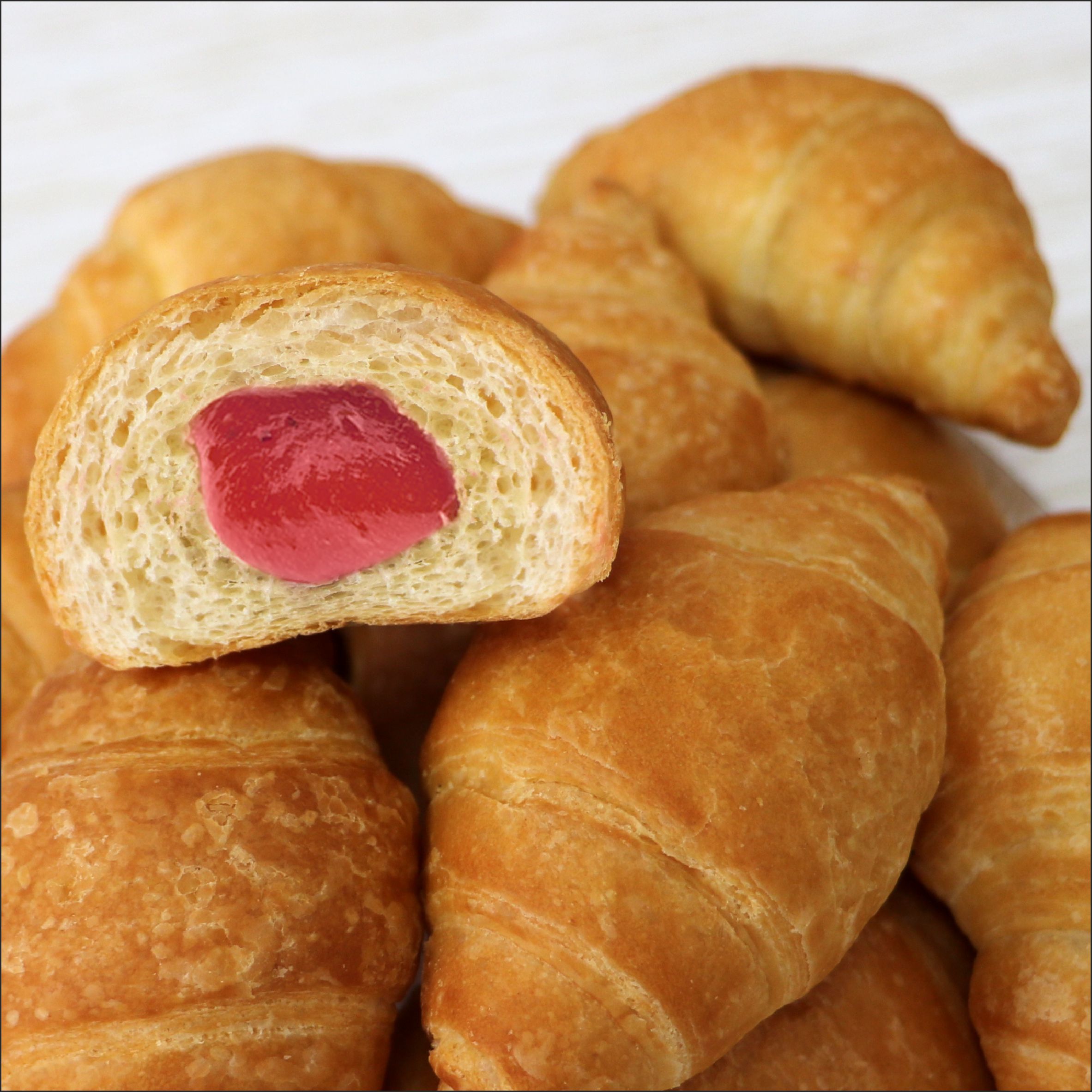 Миниатюрные воздушные круассанчики из дрожжевого слоёного теста в виде рогалика с начинкой из нежного клубничного джема и сгущённого молока.