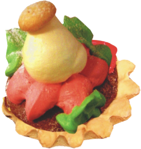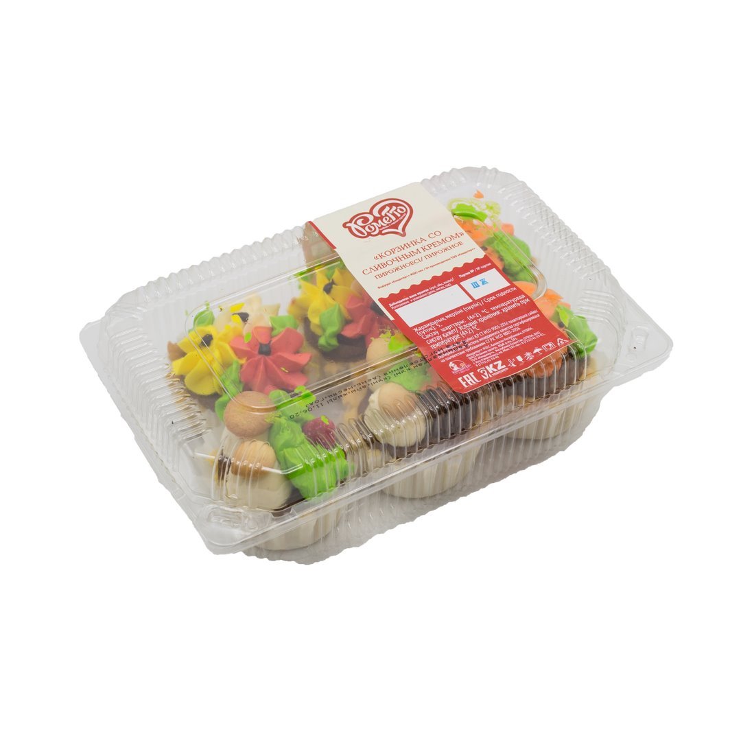 Рассыпчатая песочная корзинка с воздушными взбитыми сливками и сочной фруктовой макушкой со вкусом киви и вишни.