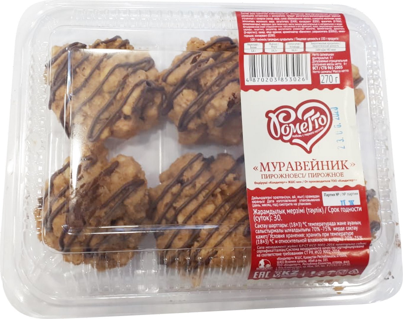 Пирожное из рассыпчатой песочной основы, щедро прослоенное сливочным кремом и вкусным арахисом, политое шоколадной глазурью.
