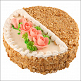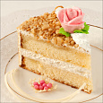 Классический бисквит пропитан сиропом, прослоен нежным сливочным кремом и обильно посыпан жареным арахисом.